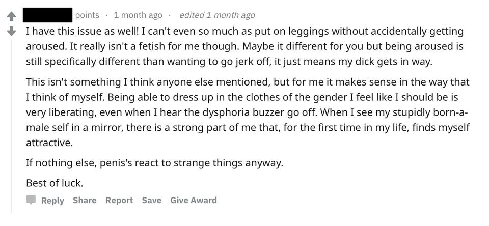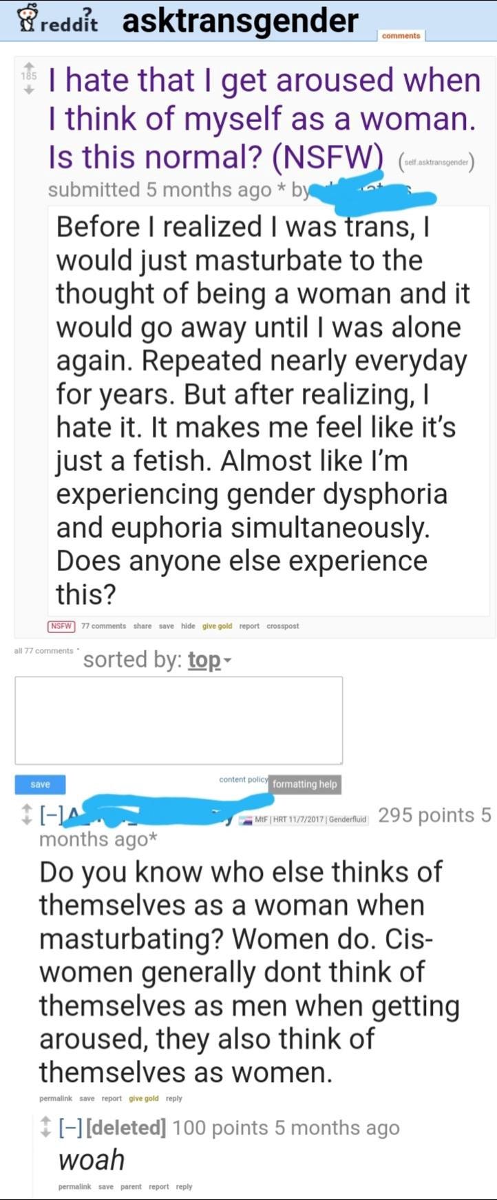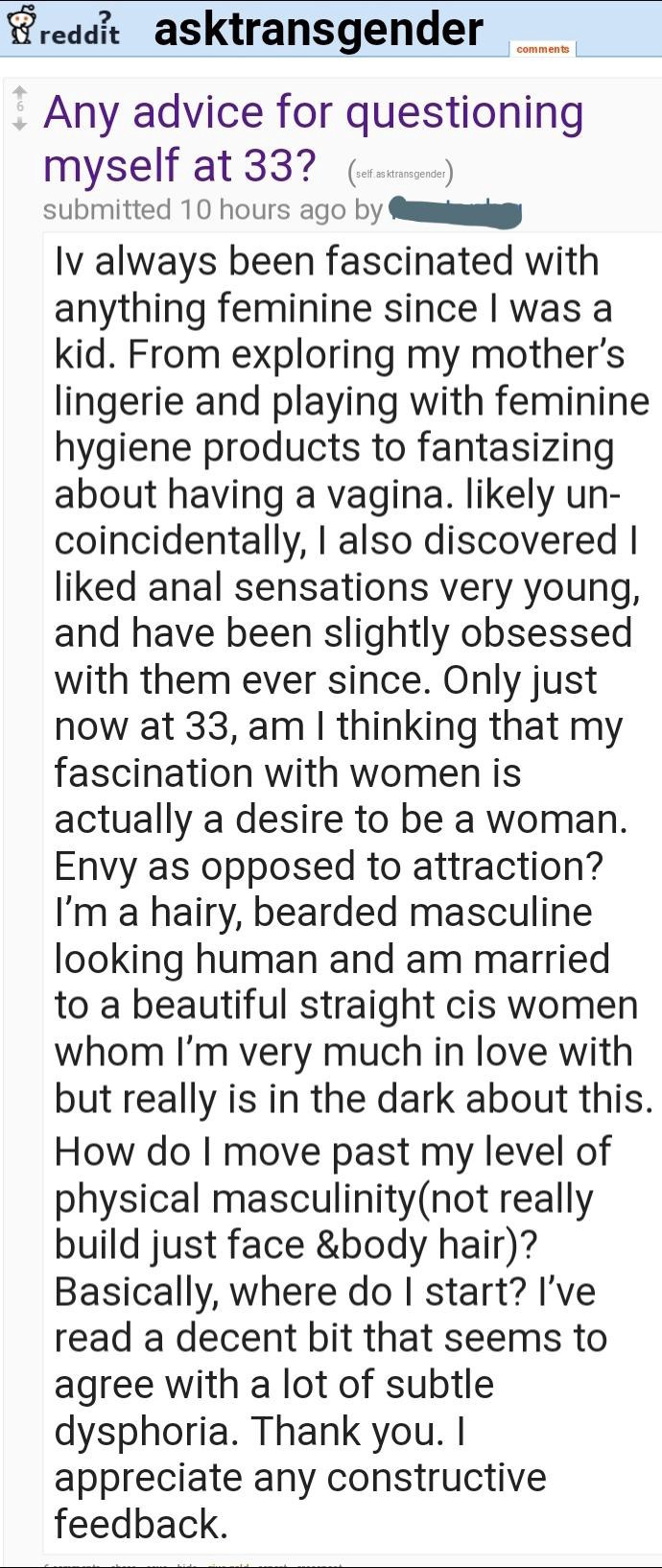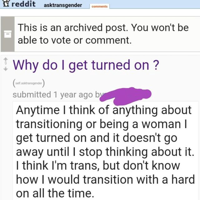 Of course, it is not difficult to find evidence of autogynephilia in action on transgender message boards. A radical feminist subreddit, called ‘r/itsafetish’, specifically tracks these message boards and posts examples of autogynephilia for all to see, including on the most popular transgender message boards on Reddit, including ‘r/asktransgender’. Here is a sample for you: