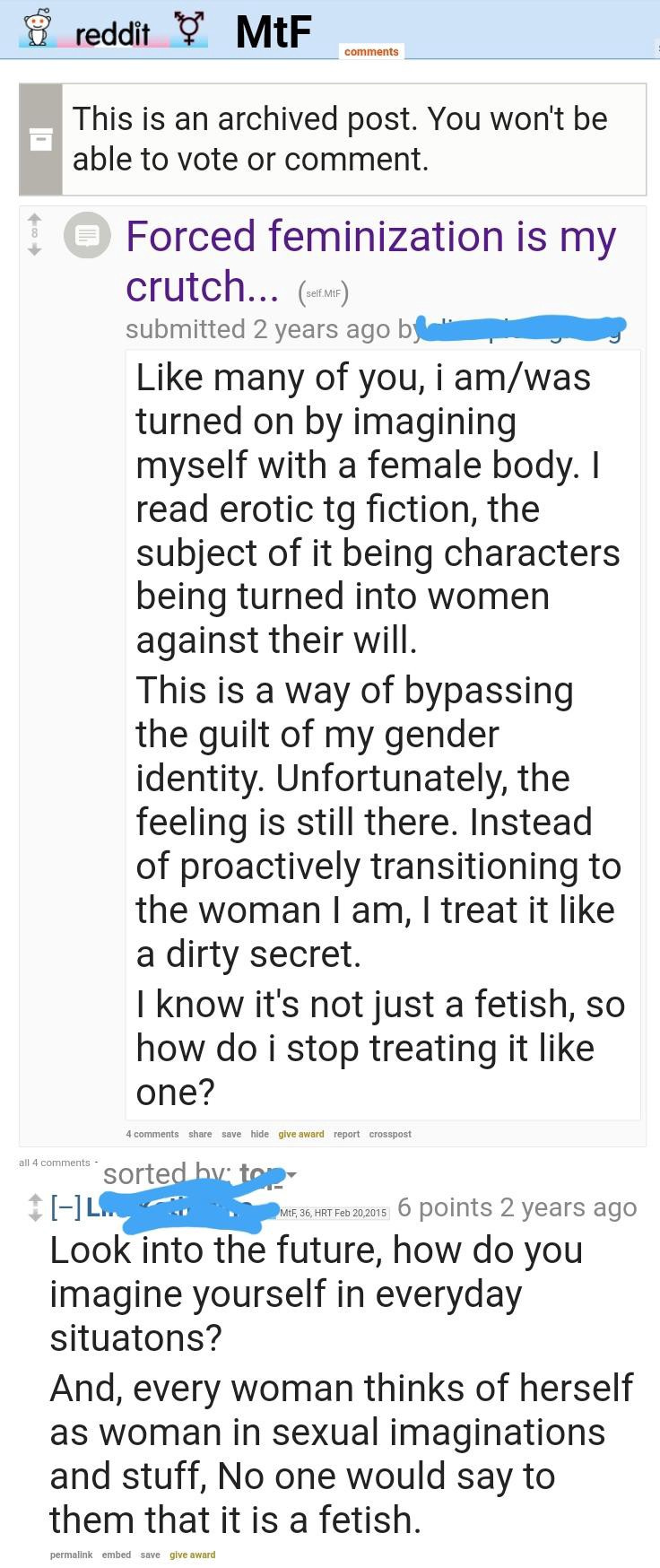 “ I will confess that officially changing my name and changing my driver’s license and ID over to “female” did sexually excite me, as I felt I had pushed myself to a point of no return. The notion of now being trapped in my new gender reminded me of all of the little pink storybooks of “forced transitions” I had bought and been stimulated by earlier.”