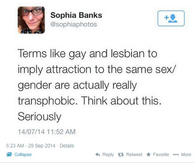 To justify this without referencing the autogynephilia, they use a very warped form of trans rights activism and transgender ideology to warp sexuality to be about ‘gender identity’ rather than sex. This is so autogynephiles can insert themselves into lesbian sexuality. Now that sexuality is about ‘gender identity’ rather than sex, the exclusively same-sex attracted lesbian, who desires only other female bodies, is now a transphobic bigot, because she’s discriminating against the autogynephiles ‘gender identity’ in denying them sex because they have male bodies. This also applies to gay men — if they say no to trans gay men, i.e females with vagina, they too are transphobic bigots discriminating against the gender identities of trans gay men. Gays and lesbians who are exclusively attracted to the same sex are ‘exclusionary’ and ‘gatekeeping’.