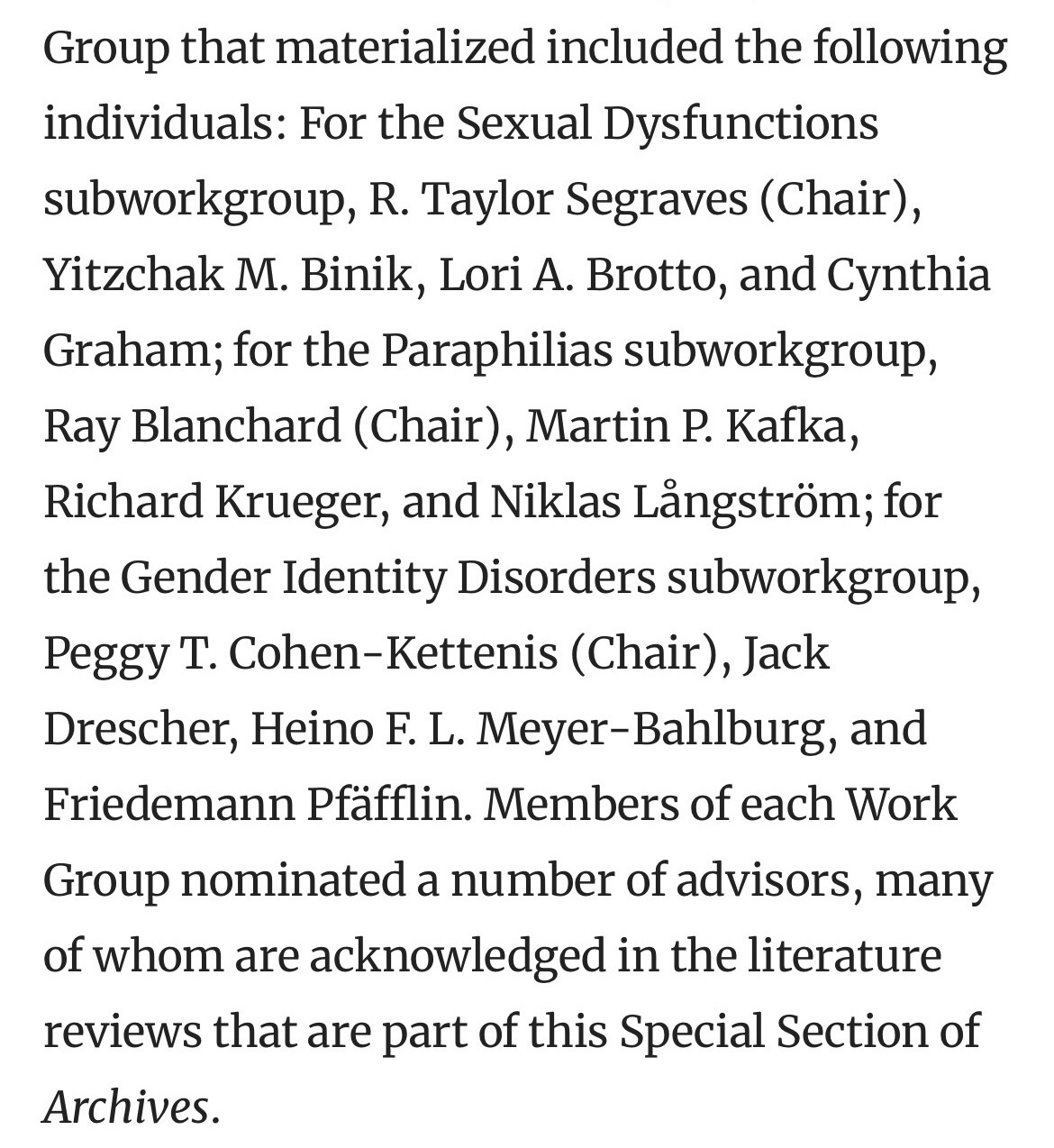 The members of the various working groups involved in deciding the content of this latest version of the Diagnostic and Statistical Manual of Mental Disorders (the 2013 DSM-5) are listed in Kenneth Zucker’s article here (and below). While Zucker took the lead role of Chair of the DSM-5 Work Group on Sexual and Gender Identity Disorders, the subgroups included those involved in producing the manual’s content on Sexual Dysfunctions, Paraphilias and Gender Identity Disorders.
