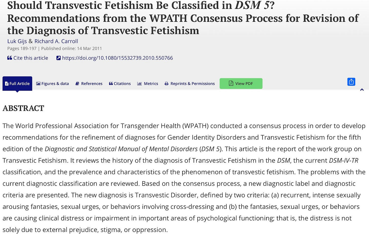 In Jesse Singal’s 2016 article How the Fight Over Transgender Kids Got A Leading Sex Researcher Fired, he describes WPATH’s Standards of Care as ‘one of the bibles for clinicians who treat transgender and gender-dysphoric patients’, which seems fitting now that we know that these Standards of Care were based more on faith in ‘gender identity’ than evidence. Considering WPATH’s now evident lack of credibility, we must ask whether mental health professionals should still be relying upon the definitions that WPATH contributed to in the latest Diagnostic and Statistical Manual of Mental Disorders (the DSM-5) or whether this should be consigned to history and replaced with standards that truly prioritise the wellbeing of both the patient and society.