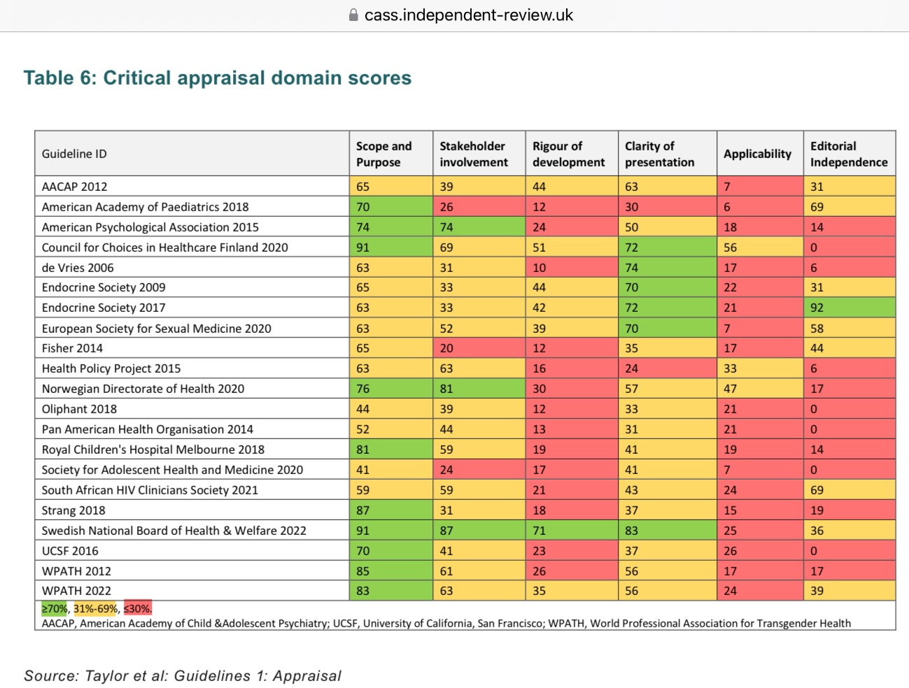 Given more recent revelations about WPATH advising on legislation around gender identity based on little to no evidence, this background of the DSM-5 is alarming. Meanwhile, Kenneth Zucker (who, as previously mentioned, was Chair of the DSM-5 Work Group on Sexual and Gender Identity Disorders) also helped to write version 7 of the “standards of care” guidelines for the World Professional Association for Transgender Health, which the Cass Review described as ‘[lacking] developmental rigour and transparency’. Cass also described how ‘for many [gender identity] guidelines it was difficult to detect what evidence had been reviewed and how this informed development of the recommendations’. In addition, Cass highlighted the circular nature of guidelines such as WPATH’s referencing one another to make it ‘[appear that] there was a consensus on key areas of practice despite the evidence being poor’.
