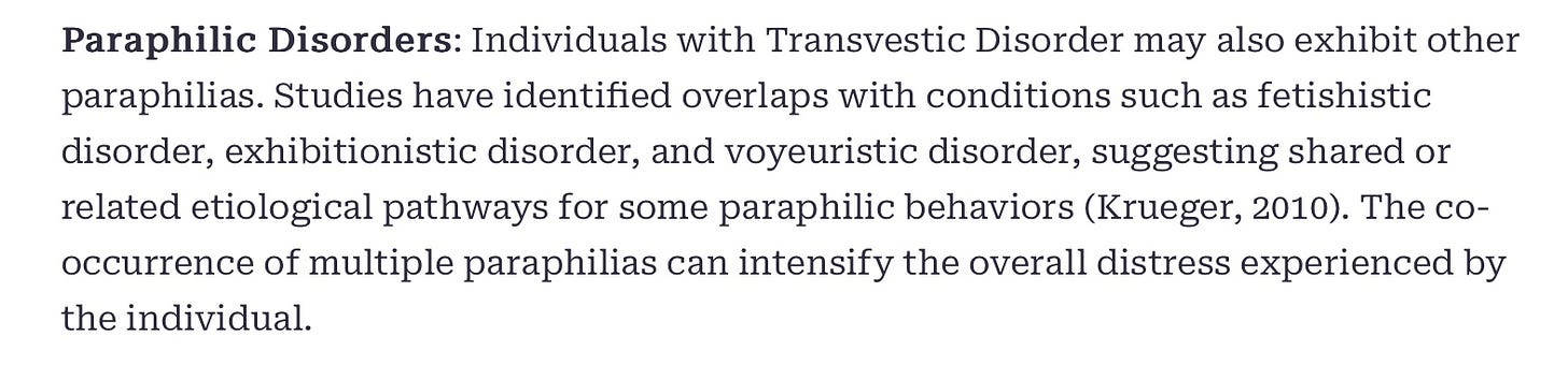 By diluting the approach to sexually motivated transvestism in heterosexual males, some mental health professionals have raised concerns that this means that behaviour which is potentially dangerous to others could go unchecked and escalate, considering that paraphilias can often coexist. However, as in this article, the focus is sometimes only put on any increased risk of distress to the individual with multiple paraphilias rather than those around them. The individual’s sexual desires are centred, while the lack of consent and potential vulnerability of those around them do not seem to be considered important at all. As described, Transvestic Disorder can often coexist alongside ‘fetishistic disorder, exhibitionistic disorder and voyeuristic disorder’, which would clearly mean that others would be affected when the individual demonstrates these behaviours.