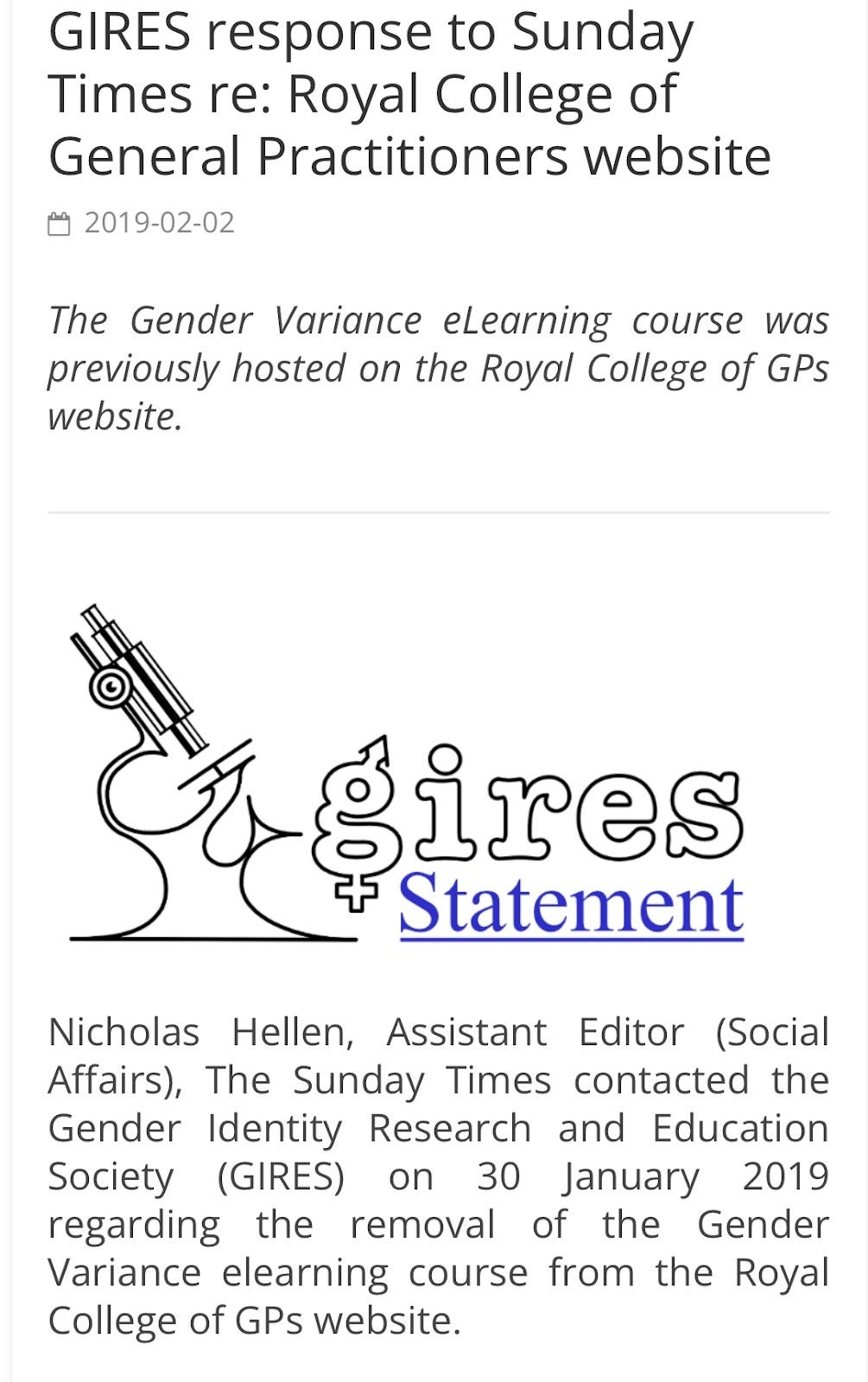 Interestingly, a rift appears to have taken place between GIRES and the Royal College of GPs in 2019. At this point, the e-learning written by GIRES was removed after a disagreement between the two organisations due to changes that the RCGP made to this with which GIRES disagreed.