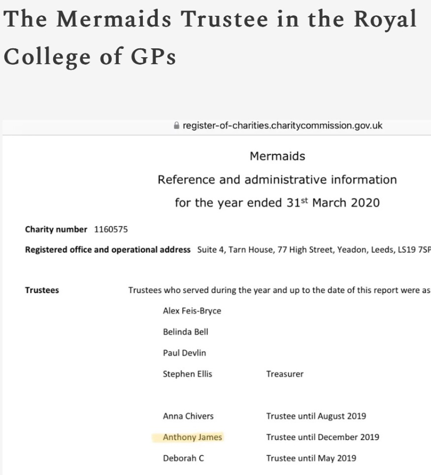 Dr Anthony James wrote this LGBT education for all GPs in collaboration with the Government Equalities Office and this was published in January 2020. Dr James only stepped down from his role as a Mermaids trustee in December 2019, so was involved in this organisation while working with the Government Equalities Office to create guidance for all GPs via their royal college.