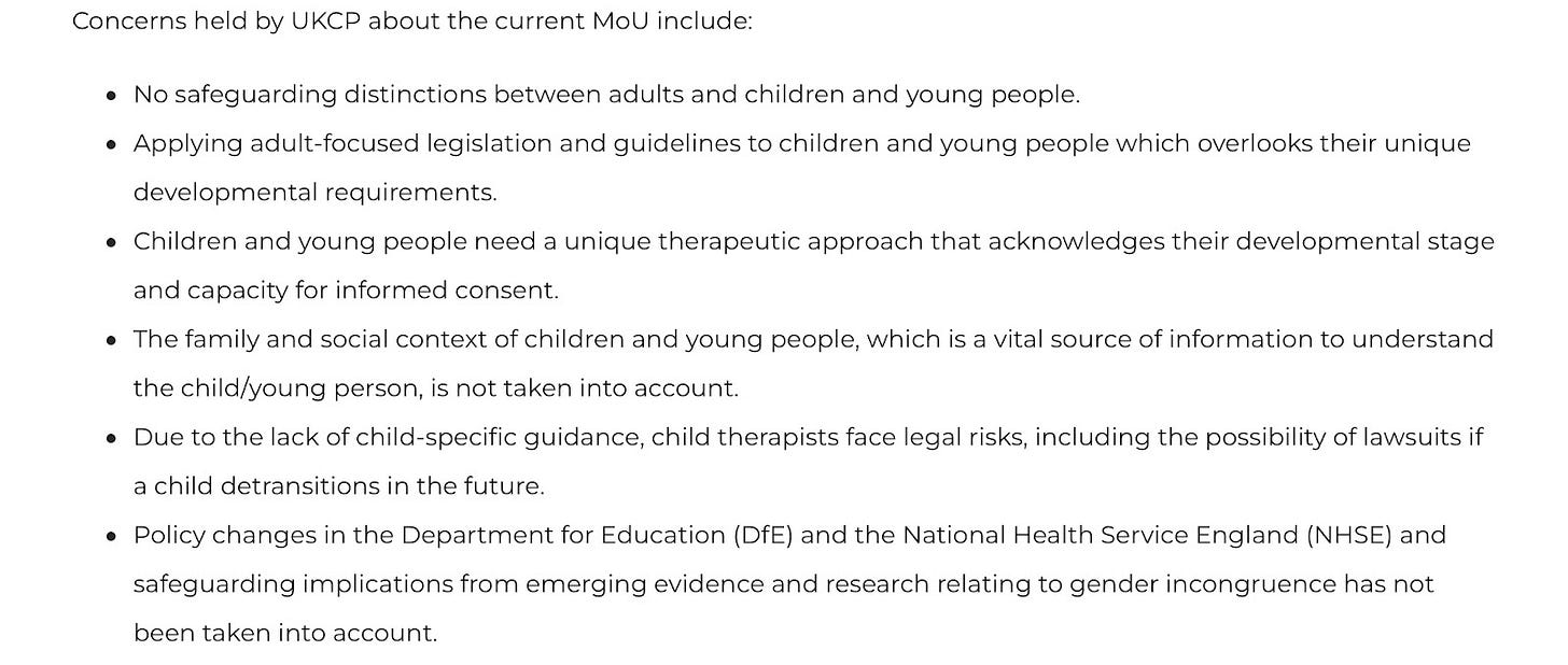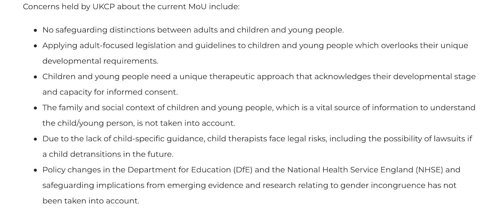 Concerns around safeguarding issues for children and adolescents recently led the counselling body the UK Council for Psychotherapy (the UKCP) to withdraw their signature from this Memorandum of Understanding. In April 2024, the UKCP stated ‘The current MoU was drafted to apply to adults and was retrospectively applied to children and young people without consultation with the relevant bodies and child therapists with the specialist and regulatory knowledge of working with children and young people’. The UKCP goes on to cite the MoU’s failure to consider children’s needs based on their stages of development and their lack of ability to give informed consent. It also describes the risk of future lawsuits for its members should it remain signed up to this, alongside the fact that emerging evidence increasingly contradicts the MoU.