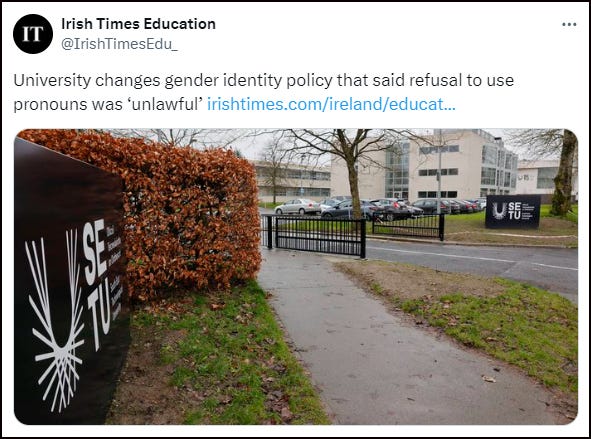 South East Technological University (SETU) published a gender identity policy in October which stated that staff or students refusing to use someone’s ‘preferred pronouns’ would amount to “Unlawful discrimination or harassment”.