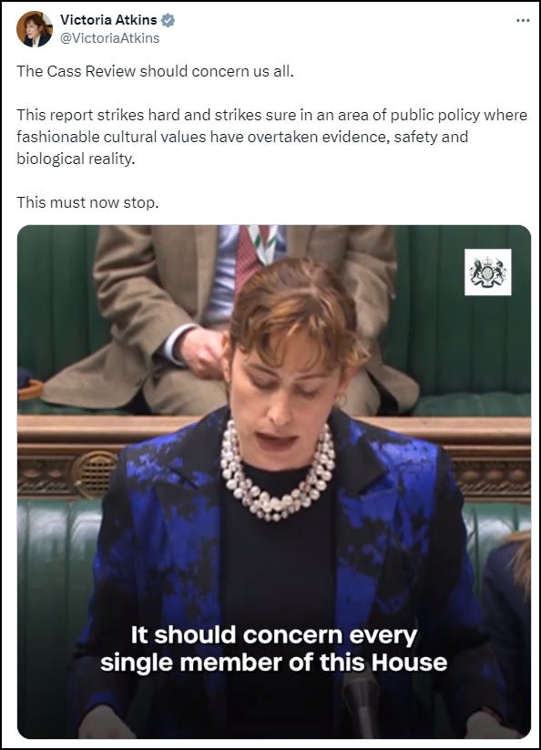 The Cass Review remains very much in the news. This week it was discussed in The House of Commons with Health and Social Care Secretary, Victoria Atkins, making an incredibly powerful statement. “Fashionable cultural values have overtaken evidence, safety and biological reality. This must now stop.”