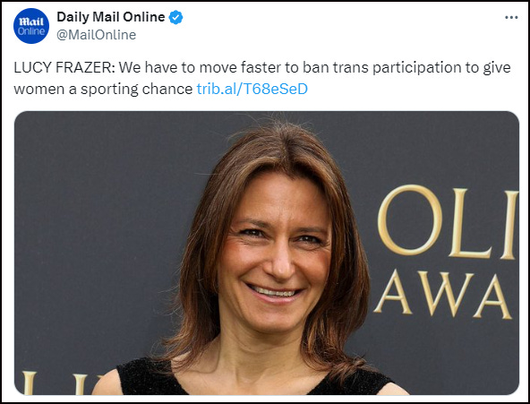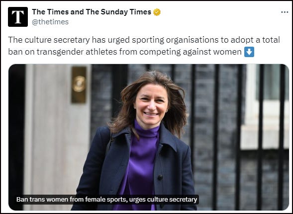 “The need for clear action from all sports becomes more pressing with each passing week… In competitive sport, biology matters. And where male strength, size and body shape gives athletes an indisputable edge, this should not be ignored… We must get back to giving women a level playing field to compete. We need to give women a sporting chance.”