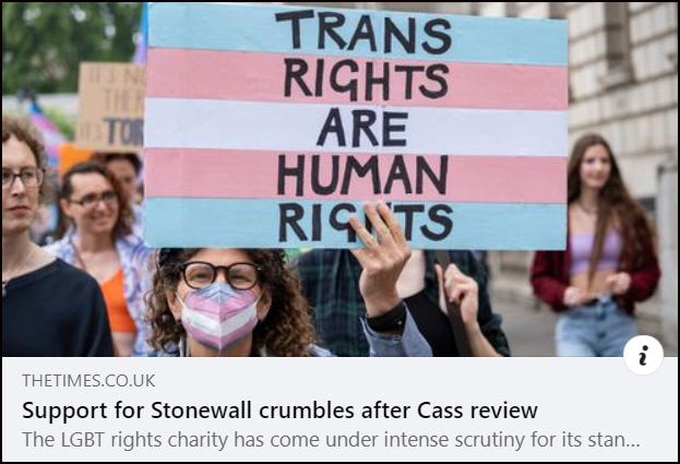 It seems that another effect of the Cass Review is the further decline in support for Stonewall, according to an article in The Times this week.