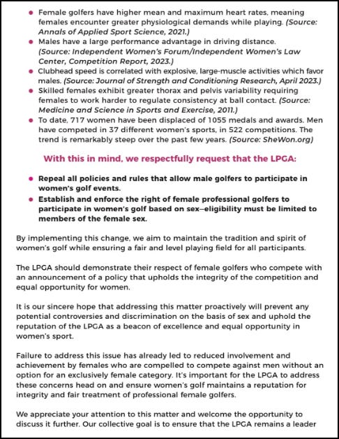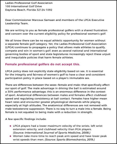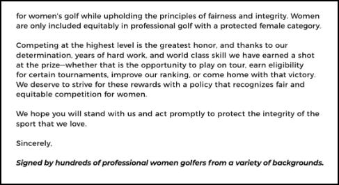 “We all know there can be no equal athletic opportunity for women without a separate female golf category… Competing at the highest level is the greatest honor, and thanks to our determination, years of hard work, and world class skill we have earned a shot at the prize—whether that is the opportunity to play on tour, earn eligibility for certain tournaments, improve our ranking, or come home with that victory. We deserve to strive for these rewards with a policy that recognizes fair and equitable competition for women. We hope you will stand with us and act promptly to protect the integrity of the sport that we love.”