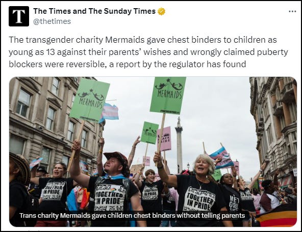 Furthermore, Mermaids was found to have provided breast binders to minors without parental consent and to have provided false information about puberty blockers on its website.