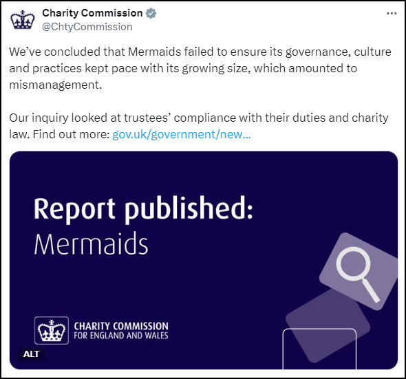 In September 2022 the Charity Commission for England and Wales opened a regulatory compliance case into Mermaids following complaints by the public and the highlighting of serious issues in the media. This action was escalated to a statutory inquiry in November 2022. The resultant report has just been published.