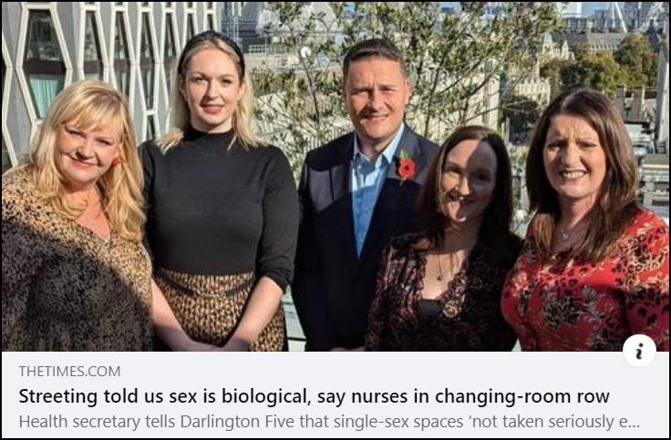 Streeting was supportive of the nurse’s case, agreed that sex is biological, said that the issue of women’s spaces is not taken seriously enough and promised to talk to government colleagues about the difference between sex and gender identity. According to The Daily Mail, when shown a photograph of ‘Rose’, Streeting raised his eyebrows. He told the nurses that “Single sex spaces matter” and commented “We’ve got to deal with this”.