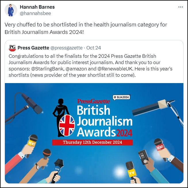 Hannah Barnes - who wrote the game-changing book, Time to Think, about the Tavistock and Portman GIDS clinic - is a finalist in the 2024 Press Gazette British Journalism Awards for public interest journalism in the health and science category.