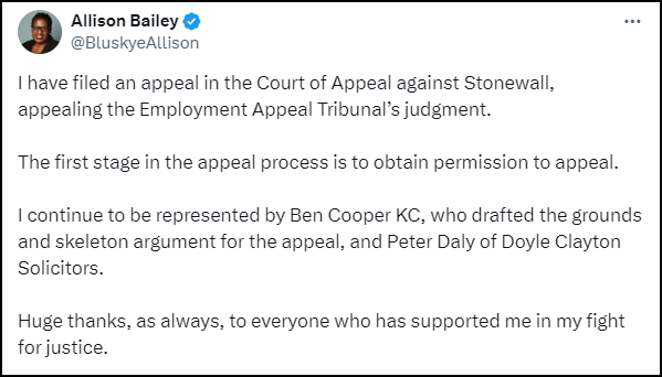 In similar news from the UK, women’s rights legend, Allison Bailey, announced this week that she has sought permission to appeal against the judgement in her case against Stonewall.