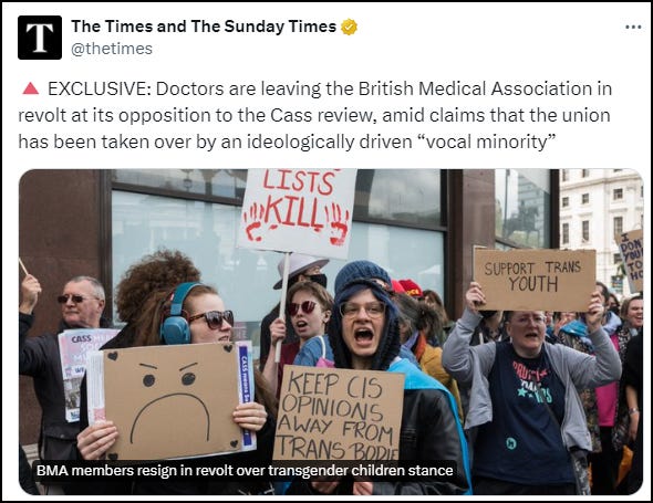 This week The Times reported that “Doctors are leaving the British Medical Association in revolt at its opposition to the Cass review… Some have resigned from the union after up to 50 years as members, and others said that the BMA’s ‘abysmal' leadership’ was ‘increasingly bonkers’ and ‘ideologically captured’”.