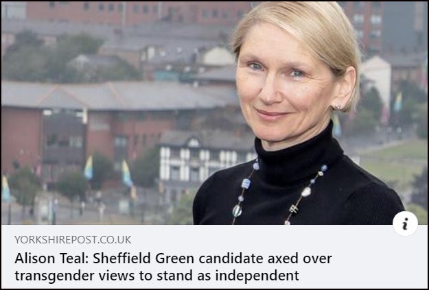Alison Teal is a former Sheffield councillor and long-standing environmental campaigner. In September 2022 she was selected by local members of the Green Party as the parliamentary candidate for Sheffield Central. In October 2022 she was suspended from the party following a complaint about her adherence to sex realism and rejection of gender ideology. When the general election was called, the party replaced her with an ‘emergency selection’ candidate.