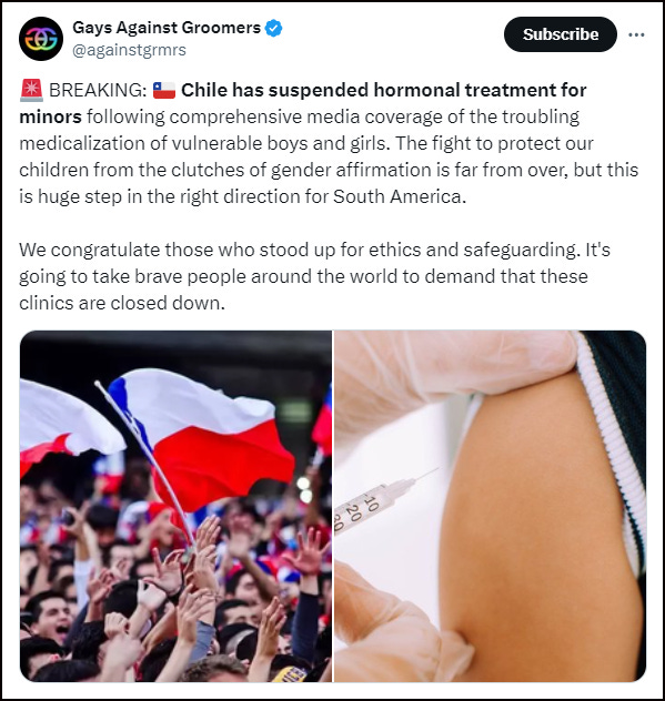 Gays Against Groomers reported that Chile has stopped medicalising gender-confused minors.