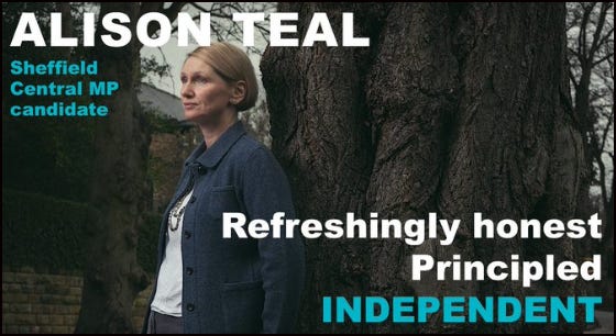 This week Alison resigned from The Green Party and she has announced that she will stand in Sheffield Central as an independent candidate. For more information and to contribute to her election campaign fund, please see this link.