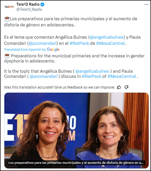 Broadcaster, Paula Comandari, reported on this story during her programme on Chile’s Tele13 radio station. She said that Minister Aguilera, a surgeon and public health specialist, acknowledged the lack of scientific evidence for using these drugs and spoke of the need to analyse The Cass Review.