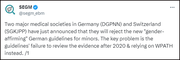SEGM writes, “The news from Germany and Switzerland signals that they may soon join the growing list of countries that have returned to the principles of evidence-based medicine in youth gender medicine, committing to sensitive and compassionate care that follows the time-honoured principle of ‘first, do no harm’”.