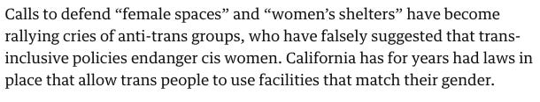 While The Guardian ignores most stories of trans-identified males attacking women, it did cover the case of Karen White - and yet the piece baldly states that suggestions that trans-inclusive policies endanger ‘cis’ women are ‘false’. Again, no evidence is given to support this claim, and notice that female spaces and women’s shelters are in scare quotes.