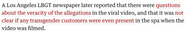 Despite being an article about a protest, it doesn’t, at any point, mention that the whole thing was triggered by a man exposing his penis to women and girls. The entire narrative is that ‘anti-trans protesters’ are simply targeting a spa because it has a ‘trans-inclusive policy’. The only reference to what actually happened last month is the statement: ‘an alleged incident in which a customer filmed herself complaining about a trans woman in the women’s area of the spa.’
