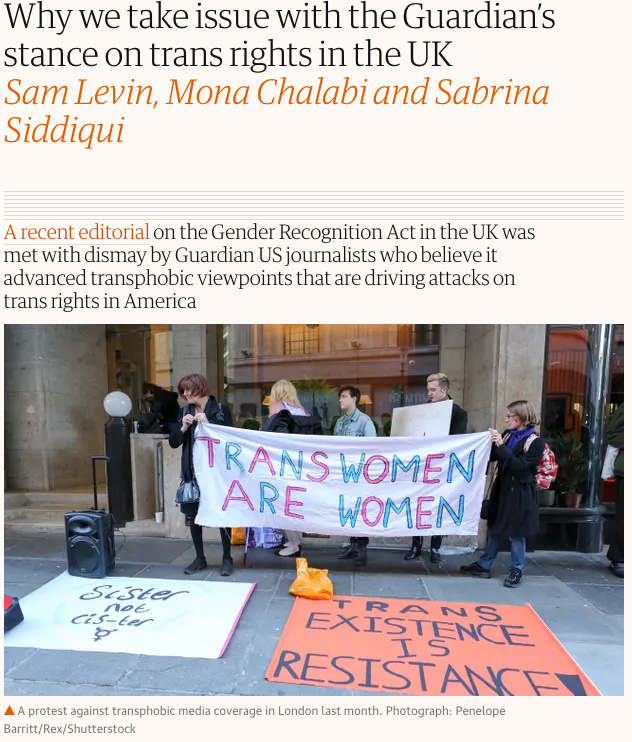 The article is co-written by Sam Levin. Sam was the lead name on this 2018 Guardian editorial which claimed that a recent Guardian comment that ‘feminists are entitled to question whether [self ID] could adversely affect other women’ was ‘transphobic’, and that ‘cis women’s intolerance should not be a legitimate reason for limiting the rights of trans women … our journalism should be grounded in the principle that trans women are women’.