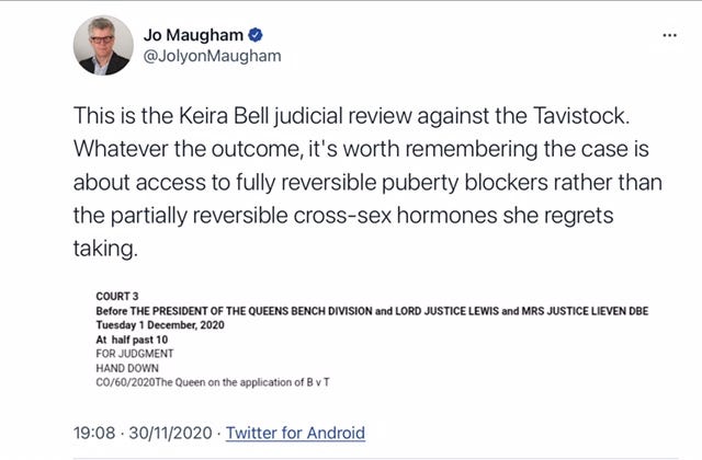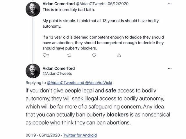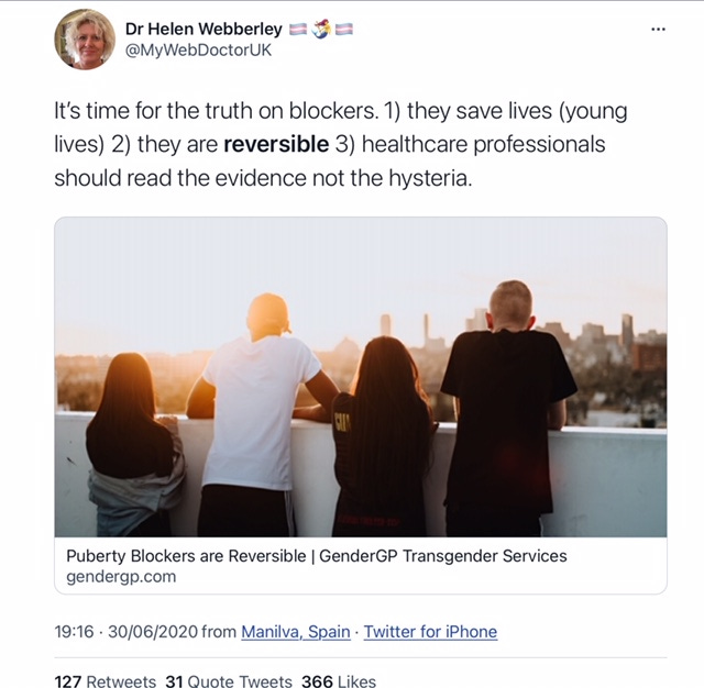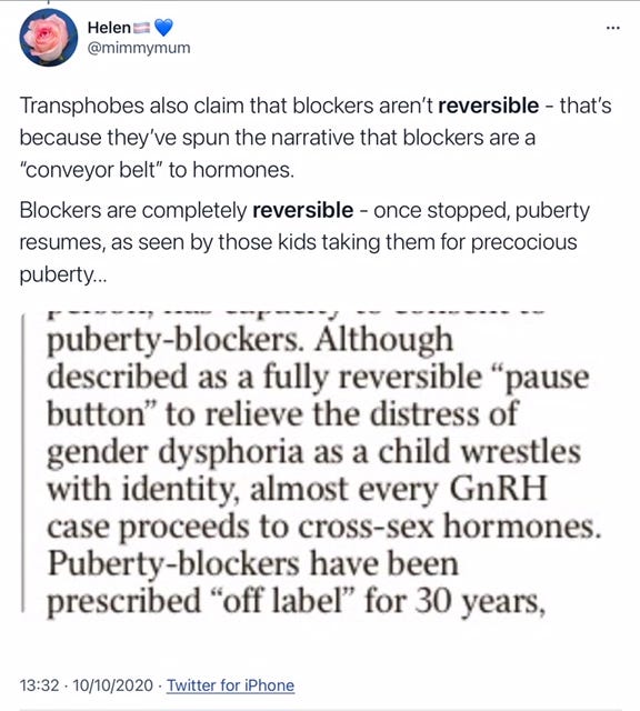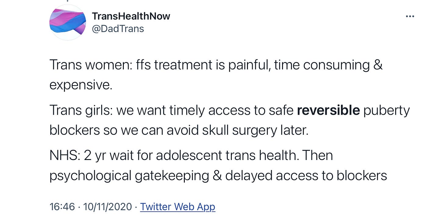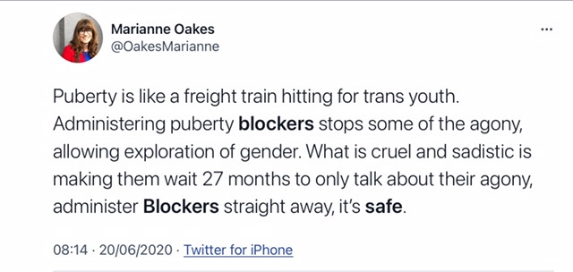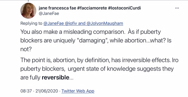 This has made me feel really sick. The comparisons made. . . how is self mutilation (or mutilation sanctioned by the very adults who are supposed to protect children) anything like abortion? The throw away language about irreversible damage being done to children's bodies, minds and lives. The stuff of nightmares. And everyday I think about parents who are trying to coax their kids out of their teenage angst and through puberty safely while the insane trans lobby screams TERF and 'child abuse' at them. A true nightmare scenario.