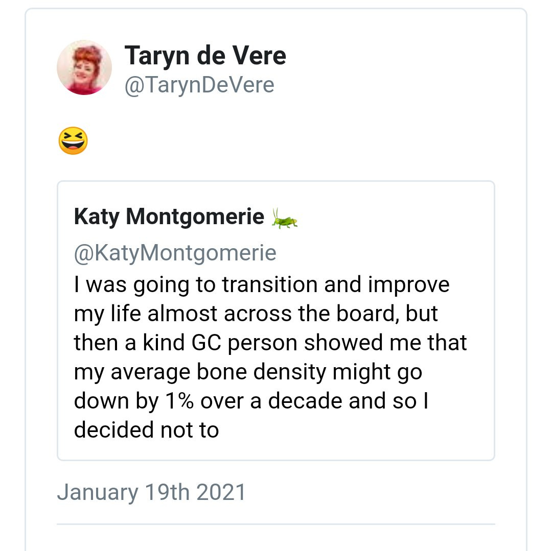 And this is GenderGP’s social media manager Taryn de Vere, the hub for the distribution of these drugs to children in Ireland, laughing with trans-identified male Katy Montgomery about the drugs they’ve been providing.
