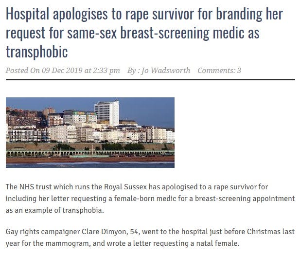This is the same NHS Trust that branded a rape survivor a bigot because she requested that a woman carry out her breast-screening appointment.