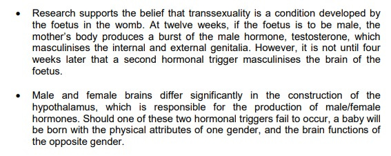 That goes to (thanks to Lily Maynard for this) these three NHS groups in Nottingham, which said, as part of their 'trans equality policy', that transsexualism occurs when a pregnant mother fails to send the same hormonal trigger to her foetus's brain that she sent to her foetus's genitals, resulting in, for example, male genitalia but a female brain.