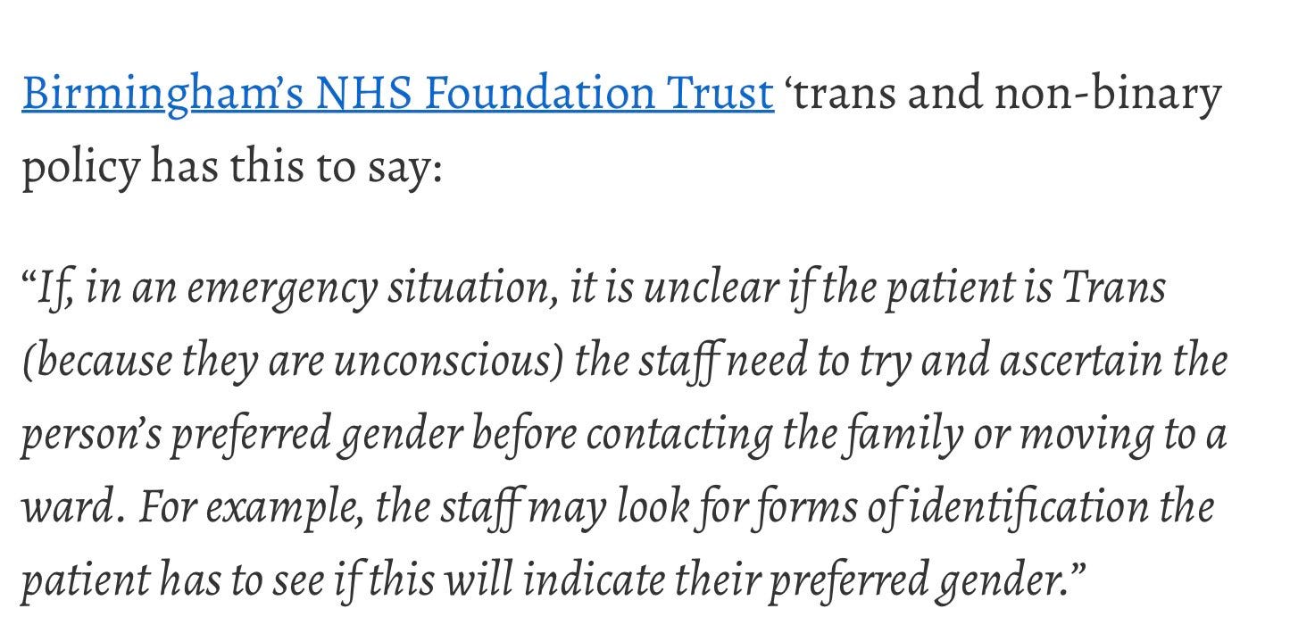 University Hospitals Birmingham NHS Foundation Trust recently stated that if someone is unconscious and it’s an emergency situation, staff should go through their pockets to try to ascertain their gender identity before talking to family or friends.