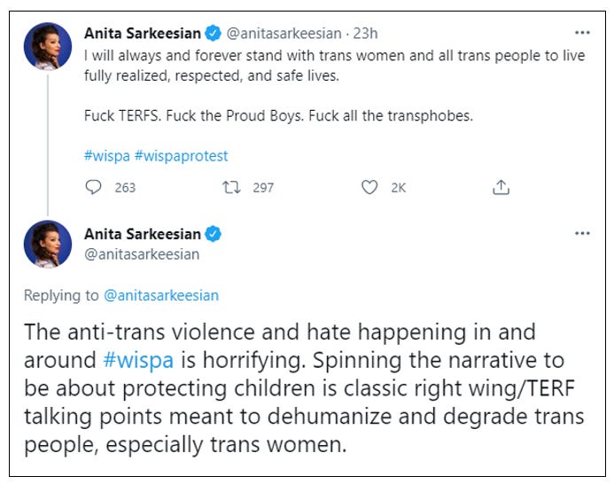 Blue-ticked ‘feminist gamer’, Anita she/her Sarkeesian, also tried to spin the ‘poor oppressed trans ladies hounded by right-wing bigots’ propaganda.