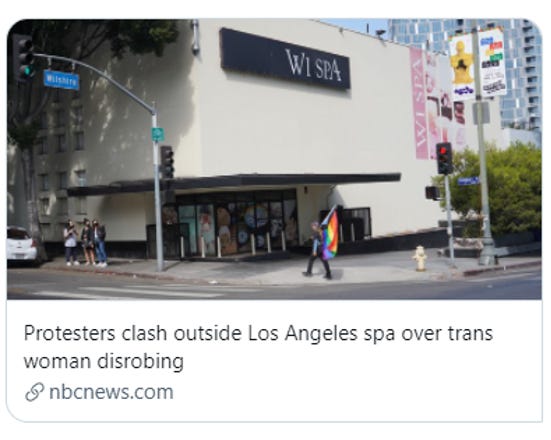 This article in Los Angeles Magazine implies that the Wi Spa Wonder Woman is the unreasonable one and describes her as ‘losing it’ and causing ‘a ruckus’. It also claims she ‘seems to deny the existence of trans people’ because she objects to a naked man in a female space. The man showing his dick to children in the ladies’, by comparison, is referred to as ‘a trans woman with male genitalia’.
