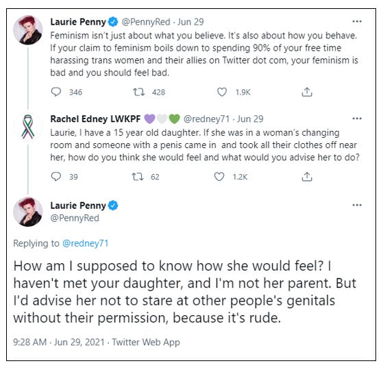 Fauxminist and gender sycophant, Laurie Penny, was asked about the experience of a 15-year-old girl encountering a naked man in her changing room. She replied “How am I supposed to know how she should feel? …I’d advise her not to stare at other people’s genitals without their permission, because it’s rude.”