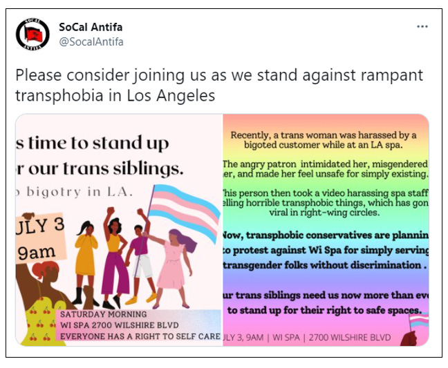 But over the weekend we were reminded how sinister the enforcement of this ideology can be when a planned demonstration at Wi Spa in Los Angeles was hijacked by violent trans activists and the Antifa rent-a-mob.
