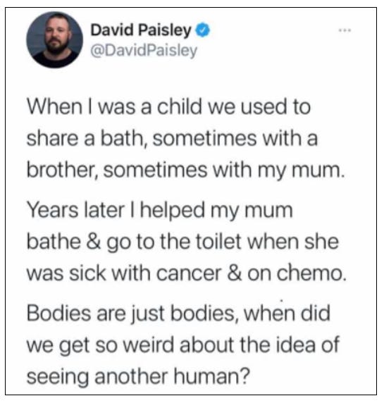 Ligneous bit-part actor and ligamentophobe, David Paisley, tried to argue that caring for a loved one in the home is the same thing as a total stranger getting his tackle out in a women’s changing room.