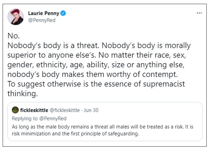 She then tried to maintain that “Nobody’s body is a threat” (no reason why transwomen can’t use the gents, then?) and she described women’s wholly justifiable need for male-free spaces as ‘supremacist thinking’.
