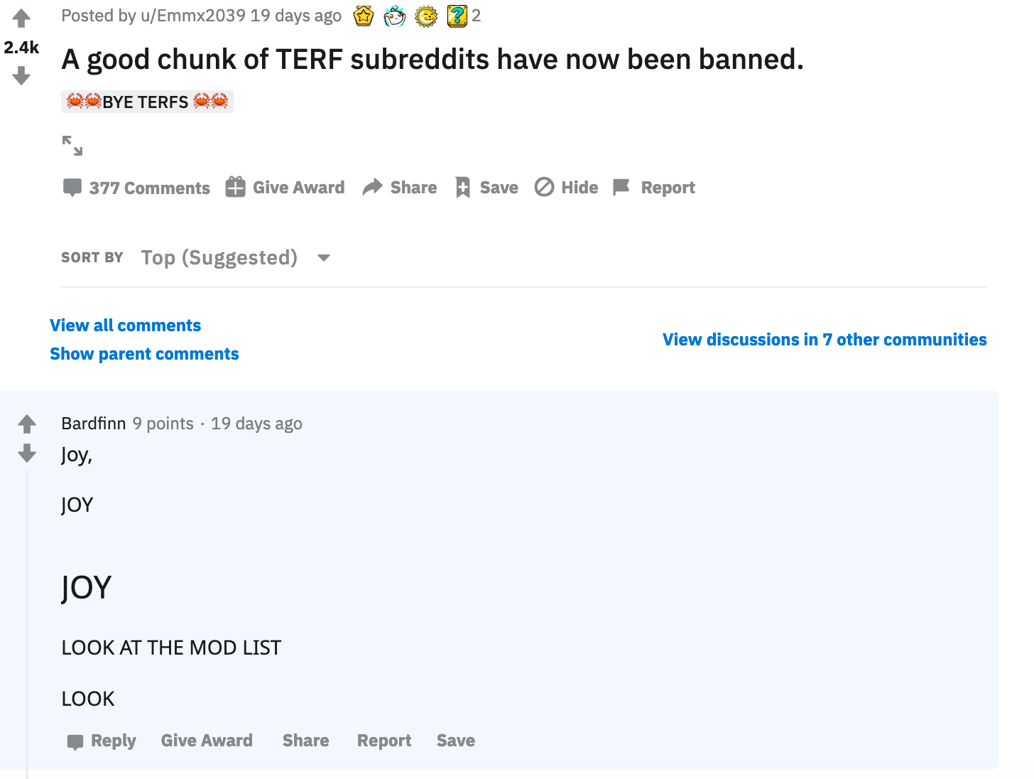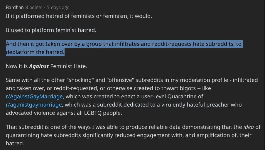 As a Reddit powermod Bardfinn moderates over 60 subreddits including r/AgainstHateSubreddits, which he and other powermods use to orchestrate ‘raids’ on subreddits they don’t like in an attempt to get them banned or in order to remove and replace the existing moderators. Bardfinn was openly involved in the permanent banning of gender-critical subreddits such as R/GenderCritical and the temporary banning, restricting and attempted takeover of r/Detrans, a place for people to discuss detransitioning and the damage done to them by the transgender movement.
