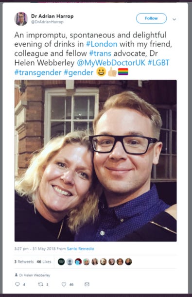 Incidentally, Webberlerley seems very cosy with self-appointed Gender Defender, Adrian Harrop, who describes her as his “Friend, colleague and fellow trans advocate”.