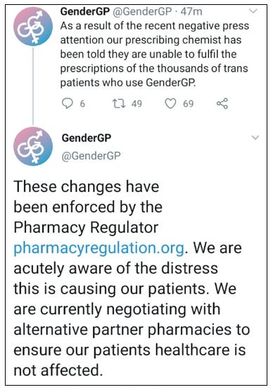 An anomaly in UK law allows British pharmacies to dispense prescriptions from offshore clinics. Consequently, GenderGP are able to prescribe blockers and hormones to patients in Britain without ever meeting them and without the clinic requiring any regulation in the UK.