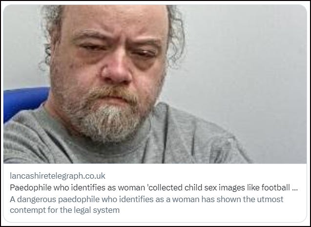 The point is that men can pose a threat to women and children however they ‘identify’ and women have every reason to fear male violence. Since it’s impossible to tell which males are harmless and which are not, basic safeguarding means we exclude all males from women’s spaces. Even the ones who claim to ‘identify as women’. This list - and it’s a far from exhaustive list - demonstrates that we are right to do so.