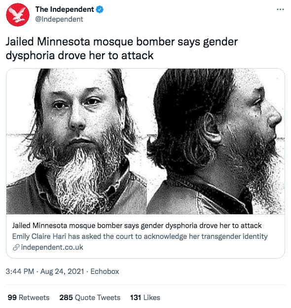 If gender dysphoria can lead to this sort of crime perhaps we should be treating it with therapy and possibly medication, instead of affirmation?