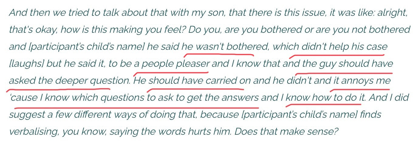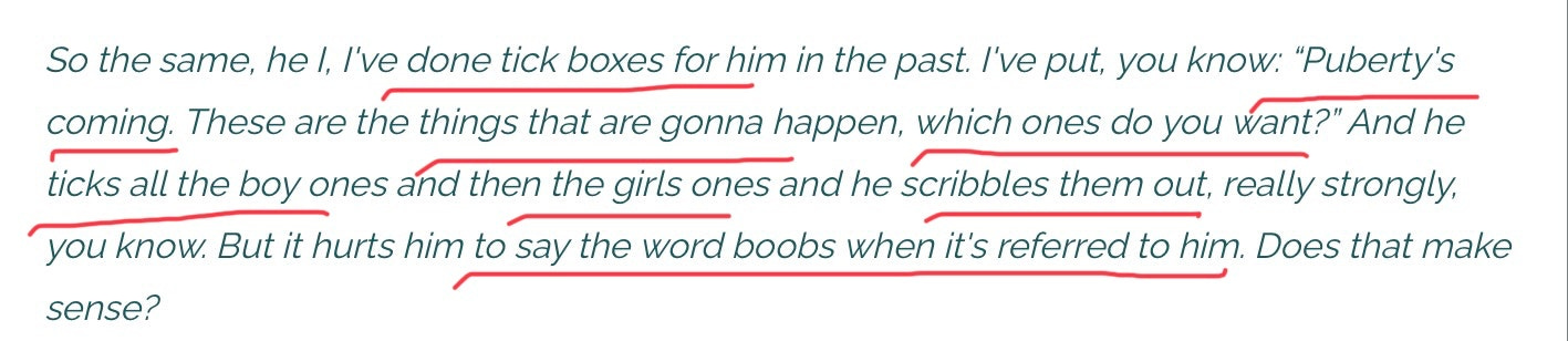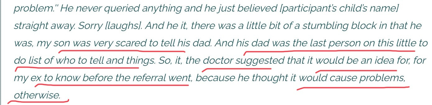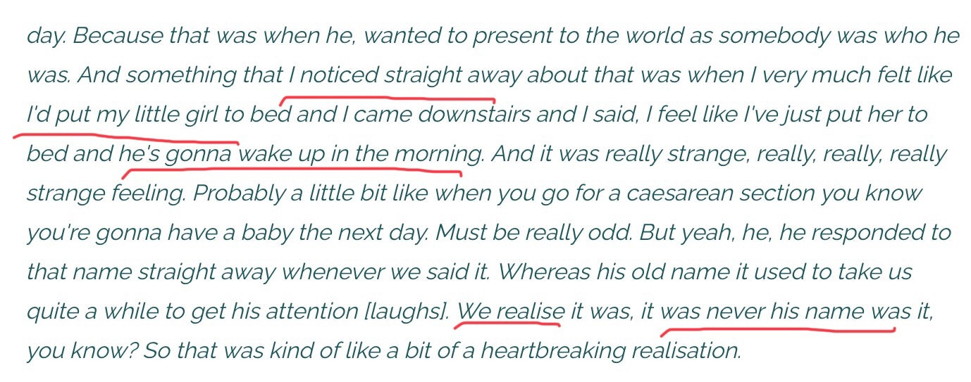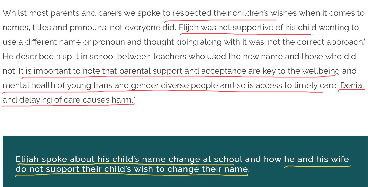 I am somewhat perturbed that this did not raise any red flags for the researchers. They were perfectly comfortable putting this in the public domain. This is in marked contrast to the treatment of a parent who was more “gender critical”; Elijah expresses concern about social and medical transition for his thirteen-year-old daughter. The researchers make their feelings about “Elijah” very clear by adding criticism/ caveats to make it clear they believed he was harming his child.