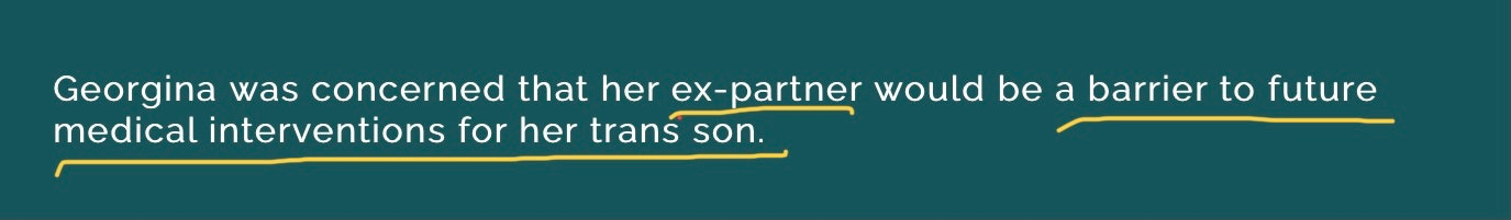 The discord between the parents figures prominently Georgina’s narrative. The father does comply with the new name and pronouns and attends clinic appointments. However, his girlfriend is described as “transphobic” and Georgina worries he will be a barrier to medical intervention. I, on the other hand, hope he acts as a last line of defence for this little girl.