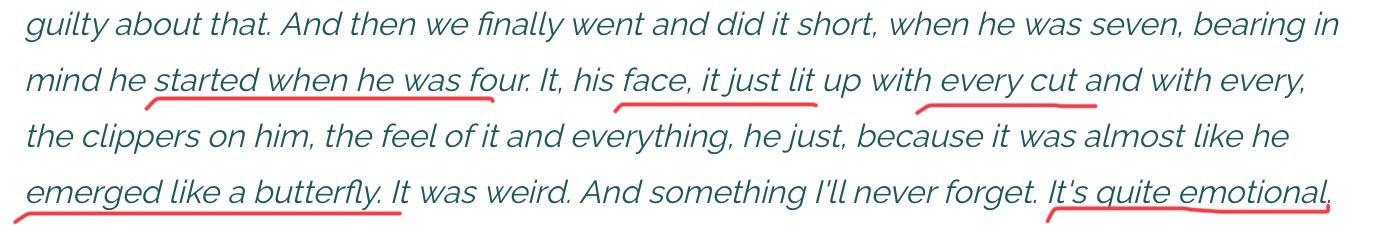 She gets very emotional when describing the trans “rite” of cutting her daughter’s hair short.