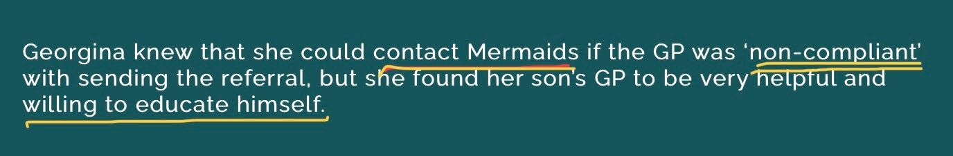 Also on Georgina’s check list was getting a referral to the Gender Identity Service (GIDs). She makes an appointment with her GP, immediately, and consults Mermaids, trans lobby group, for advice on how to ensure the doctor would comply with her wishes.