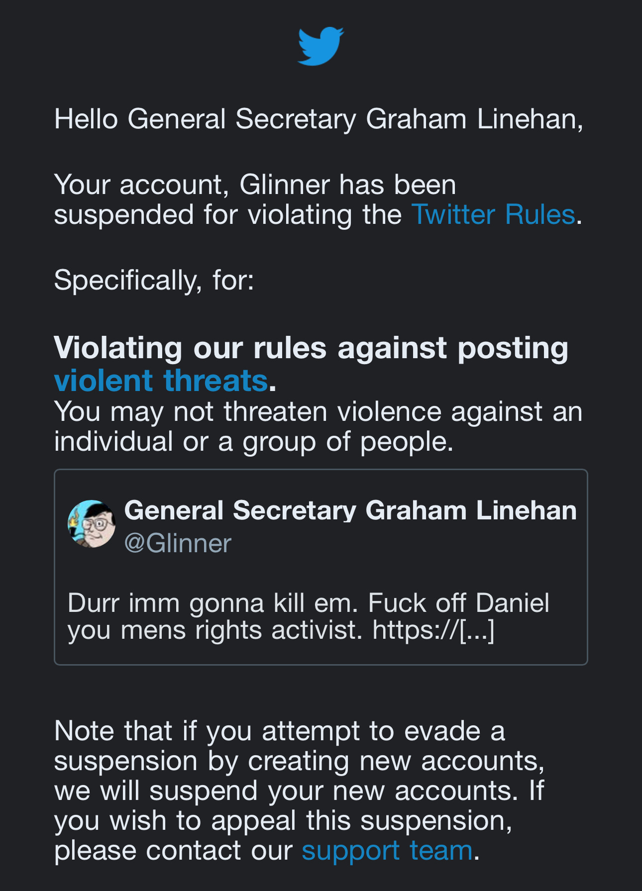 I get reported all the time by trans rights activists but I thought Elon’s sweep had removed the bad actors within the company. Apparently there’s a few still about because my two appeals have been denied. One would think the “Durr” made it clear what I was doing but evidently not.